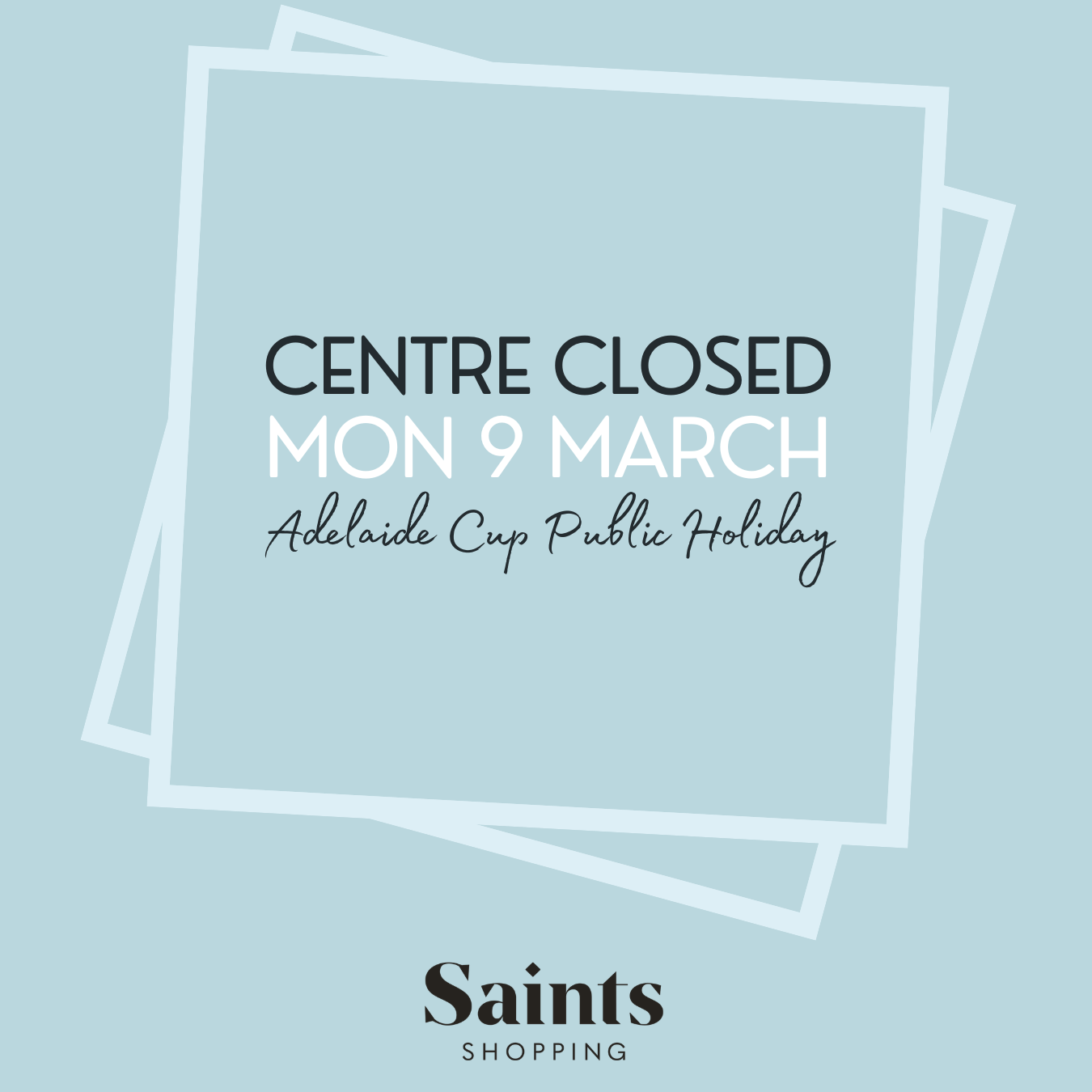 Saints Shopping is closed Monday 9 March for the Adelaide Cup public holiday.